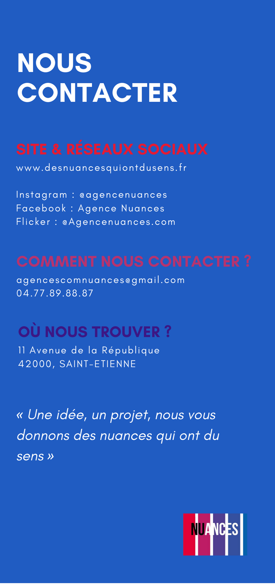Cela commence par un logo dévoilant l'identité visuelle de l'agence. Nous avons eu l'idée tout d'abord du nom "nuances", représentant la variété de possibilité que peut avoir une idée ou un projet. Ensuite nous devions choisir une charte graphique avec des couleurs, des formes etc. Nous avons choisi un dégradé du rouge au bleu en forme de barres. Cela nous a permis d'encrer le nom de notre agence et de démontrer les nuances de possibilités.